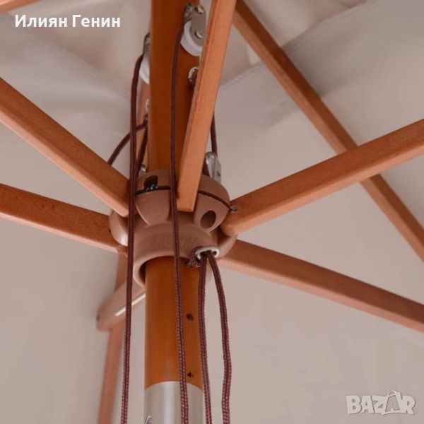 Стълб от масивна елхова дървесина: В карамелено кафяво измиване на петна, осигурява здрава и здрава структура, която ще държи външния чадър изправен и на място през целия ден. Шест бамбукови ребра: Поставени между чадъра за градинска маса, осигурявайки допълнителна опора при по-силен вятър и време.