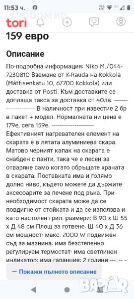 Ефективният нагревателен елемент на скарата е в лятата алуминиева скара. Матово черният капак на скарата е снабден с панти, така че е лесен за отваряне само когато обръщате храната в скарата. Поставката има и голямо долно ниво, където можете да държите аксесоарите за печене под ръка. При необходимост скарата може да се повдигне от стойката и да се използва и като настолен грил. размери: В 90 х Ш 55 х Д 48 см Площ за готвене: Ш 40 х Д 36 см мощност: макс. 2000 W подвижен съд за мазнина: има безстепенно регулируем термостат