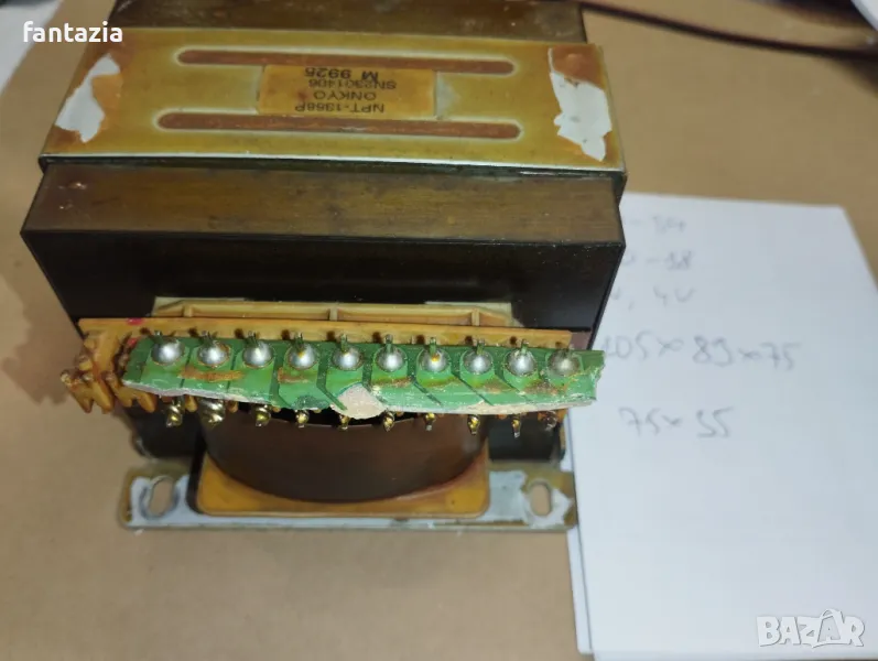 Продавам работещ трансформатор, демонтиран от ресивър Onkyo, с вторични напрежения 34-0-34V, и с малка мощност 18-0-18 V, 11 V, 4 V мощност около 450VA, размери на магнитопровода 105*89*75 мм, сечение на магнитопровода около 24 кв.см.