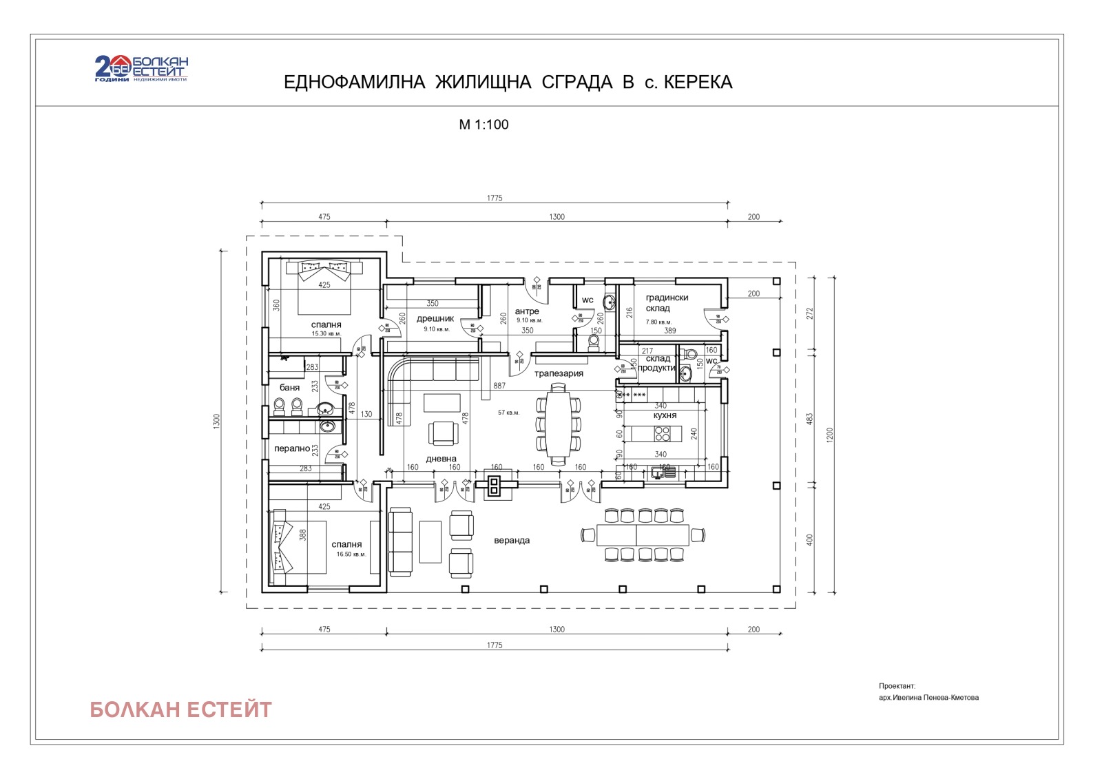 Агенция БОЛКАН ЕСТЕЙТ предлага за продажба Урегулиран Поземлен Имот в село Керека,община Дряново. Имотът се продава заедно с одобрен архитектурен проект и разрешение за строеж на еднофамилна къща с РЗП 242 кв.м. включваща веранда,две спални,дневна с кухня,сервизни помещения и две паркоместа, плътност на застрояване 12,8%,КИНТ 0,13 ,озеленяване 76%.Сключени са договори за присъединяване към електрическата мрежа с Енерго-Про и ВиК-имотът се продава с ток и вода. Парцелът е с площ 1880 кв.м.,разположен на асфалтов път,с южно изложение и прекрасна панорама.Селото е много комуникативно-само но 5 км. От Дряново и на 18 км. От Велико Търново.