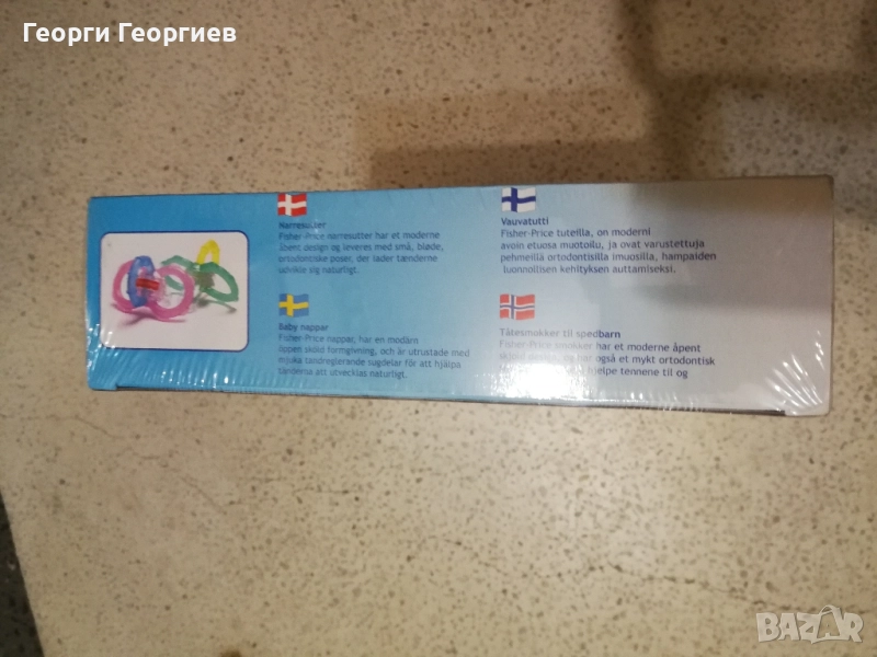 Това е комплект за новородени от Fisher-Price, който включва бутилки за хранене. На кутията се виждат и награди, като например „Mother & Baby Silver“ и „2006 babygeor PLATINUM AWARD“. Комплектът съдържа бутилки и биберони с различни цветове и размери, предназначени за хранене на бебета от раждането до по-късна възраст. Бутилките са без съдържание на BPA (бисфенол-А) и са създадени, за да улеснят прехода от кърмене към хранене с бутилка. Марка: Fisher-Price Вид продукт: Подаръчен комплект за новородено Съдържание: Бутилки за хранене и биберони Характеристики: BPA-free, дизайн за лесен преход от кърмене Език на кутията: Датски, шведски, фински, норвежки Награди: Mother & Baby Silver, 2006 babygeor PLATINUM AWARD