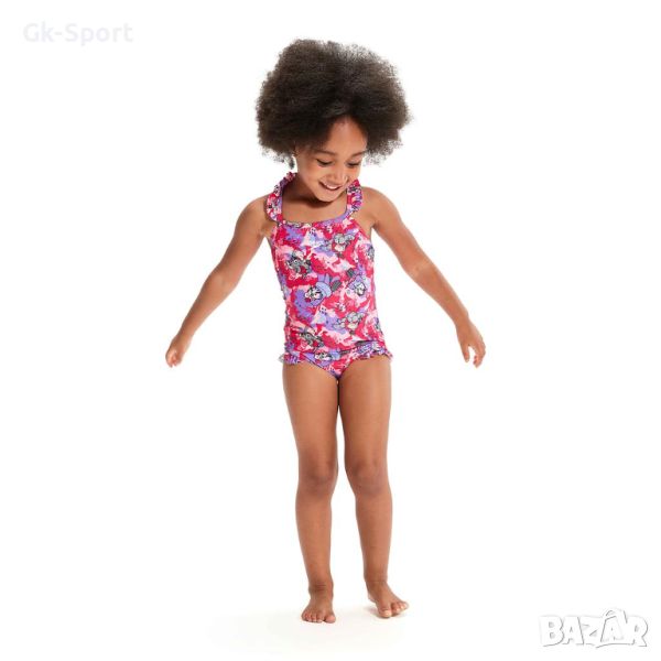 Присъединете се към изцяло новия отбор "Научете се да плувате" на магическо приключение на плажа Бонди! Красив бански в розово и лилаво, този забавен плувен костюм с тънки презрамки е идеален за малките плувци и включва новите ни весели герои Ария Видрата и Ели Слончето, които се наслаждават на вечерно плуване. Малките деца ще харесат детайлите с волани, докато дизайнът с тънки презрамки им позволява да пляскат и играят без ограничения. С по-висока устойчивост на хлор от стандартните материи за бански костюми, банският костюм предлага отлична задържане на формата и запазва вида си като нов за по-дълго благодарение на CREORA® HighClo.