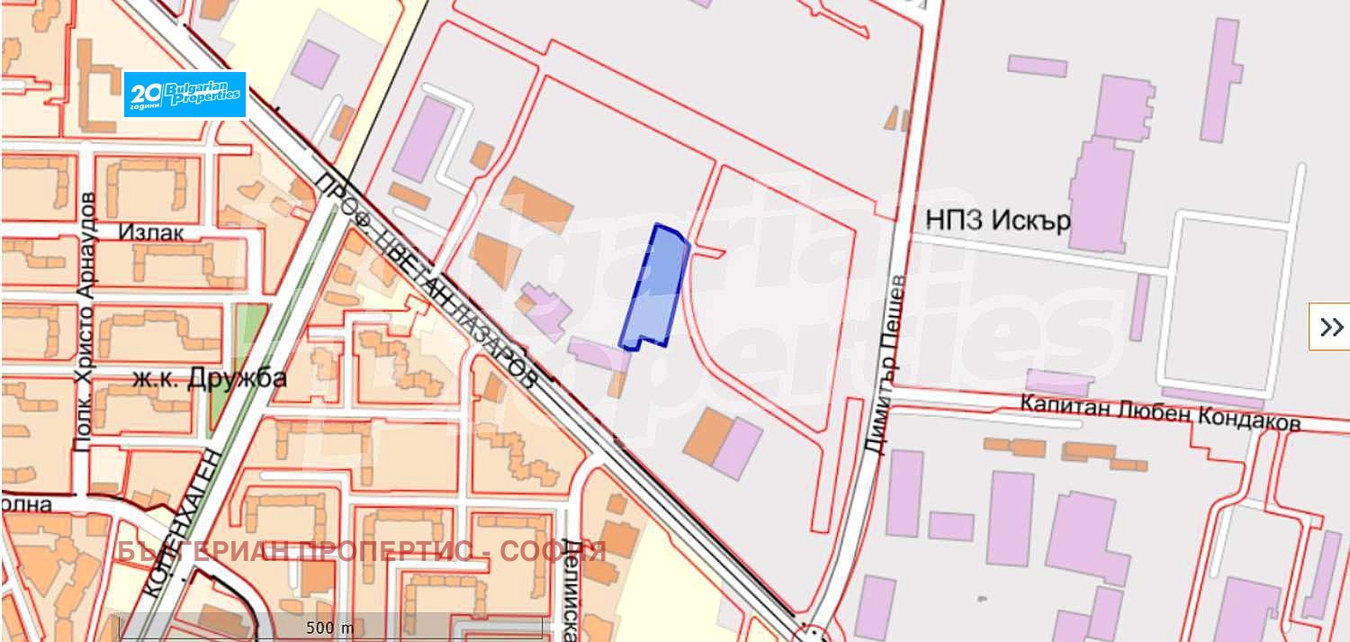Представяме на вашето внимание отличен парцел за застрояване с комуникативна локация на втора линия до бул. Проф. Цветан Лазаров в кв. Дружба 2. Парцелът е подходящ за производствени, складови, административни, търговски и обслужващи сгради, работилници. Допуска се изграждане и на жилищни сгради, както и общежития за персонала в предприятията, магазини и заведения за обществено хранене, здравни заведения, професионално-технически училища и професионални бази.