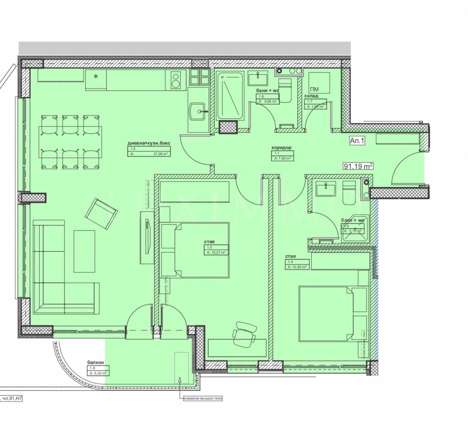 На чиста площ от 91.19 кв.м са разпределени: