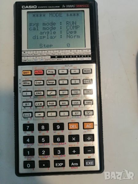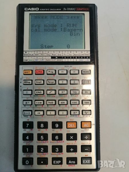 Калкулаторът е идеално запазен и работи отлично.Casio FX-7000G е калкулатор , който е широко известен като първият в света графичен калкулатор, достъпен за обществеността. Той беше представен на обществеността и по-късно произведен между 1985 и c. 1988. [2] Забележителни характеристики са способността му да изгражда графики на функции и че е програмируем . Калкулаторът предлага 82 научни функции и е способен на ръчно изчисляване за основни аритметични задачи.