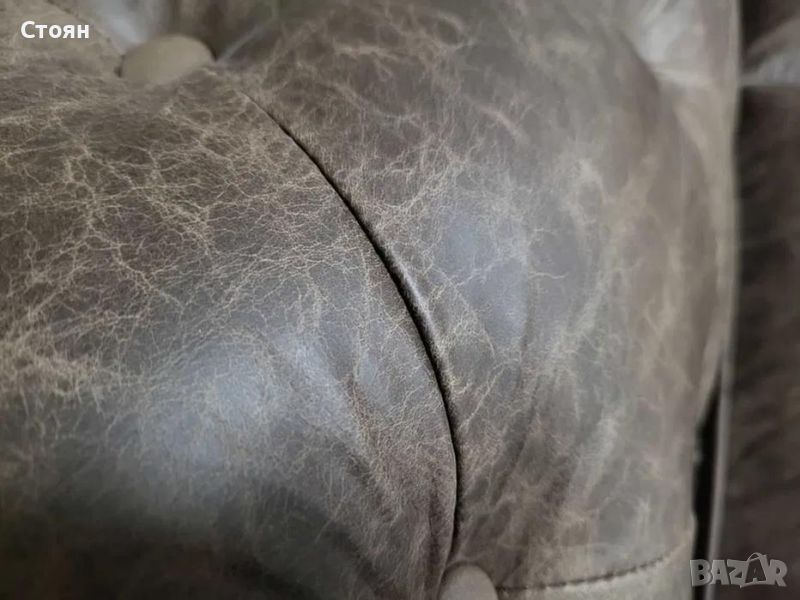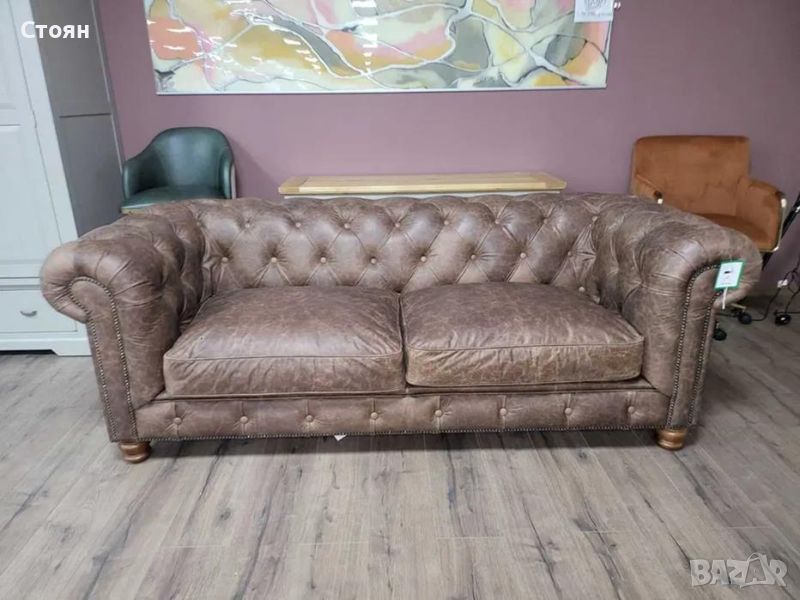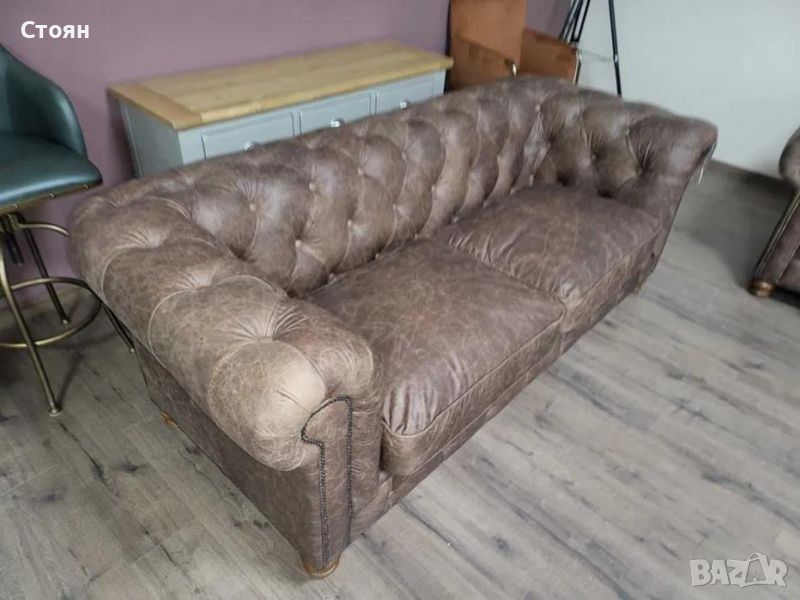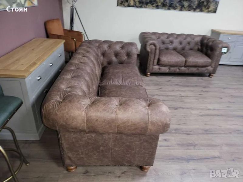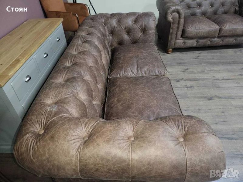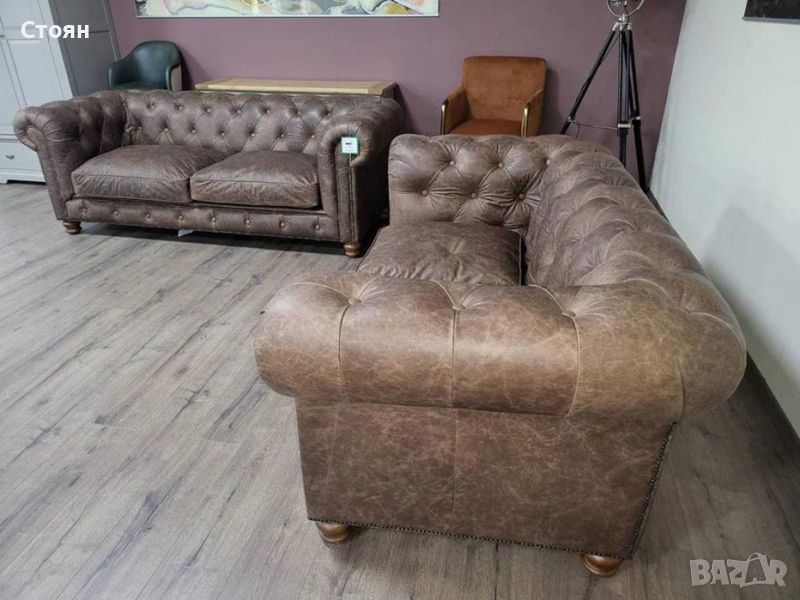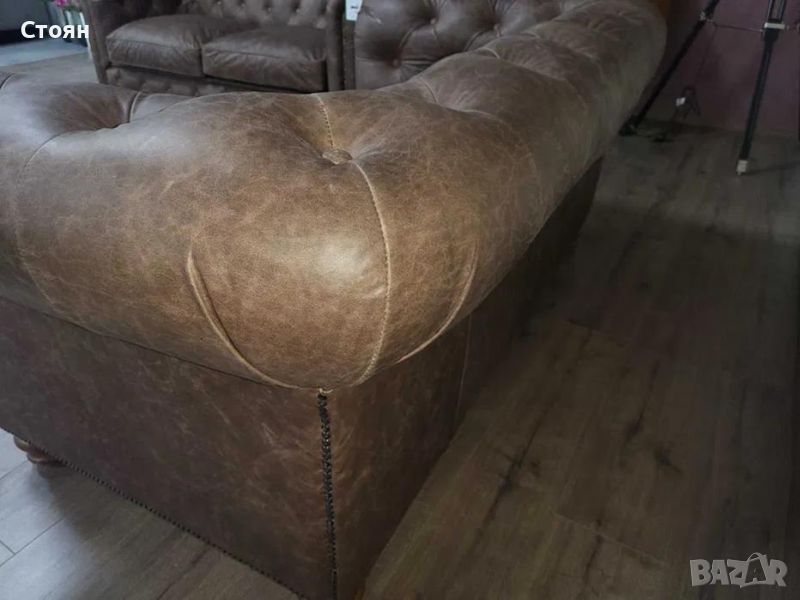 Антично кафяв кожен комплект тройка и двойка Честърфийлд → Обява 46474556