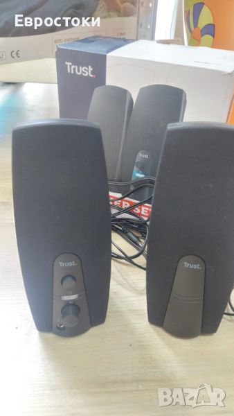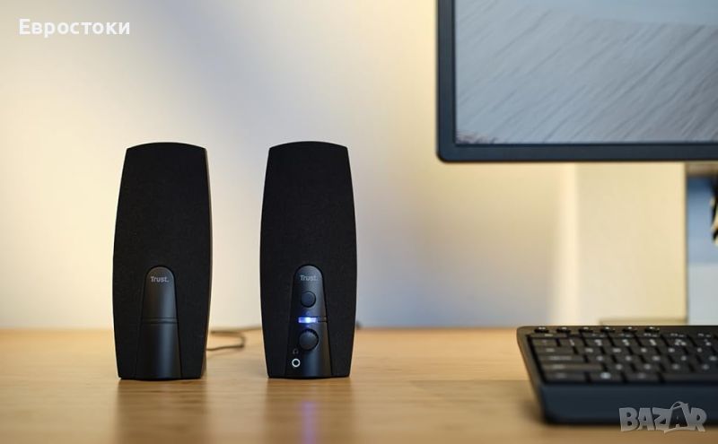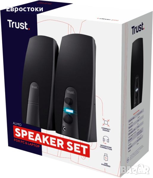 Комплект високоговорители Trust Almo 2.0 за компютър, 10 W пикова мощност, захранвана от USB звукова система, 3,5 mm аудио връзка, високоговорители с чист звук за компютър, лаптоп, Mac - черен [Ексклузивно за Amazon]