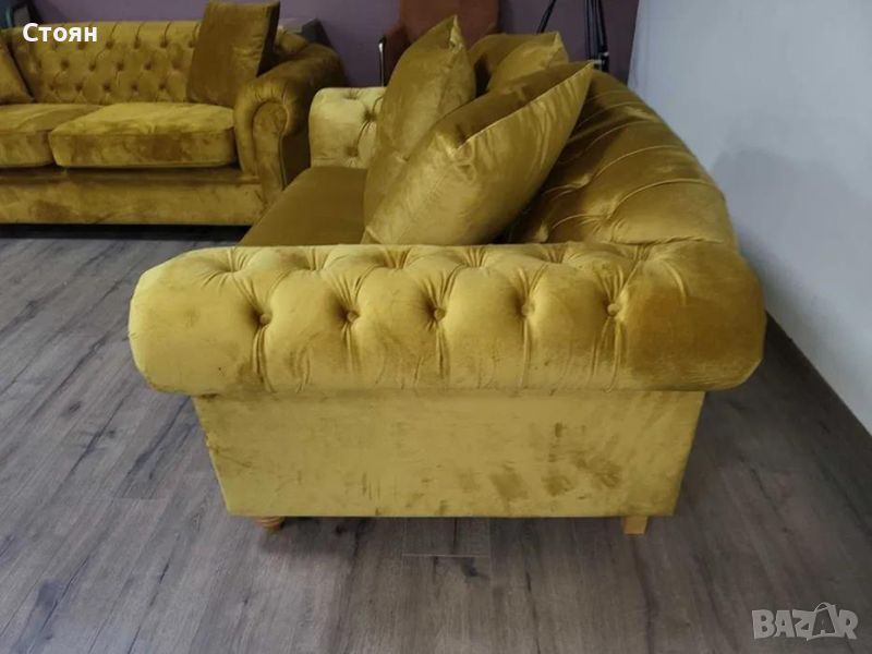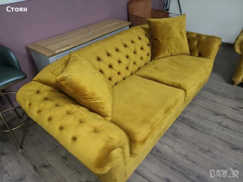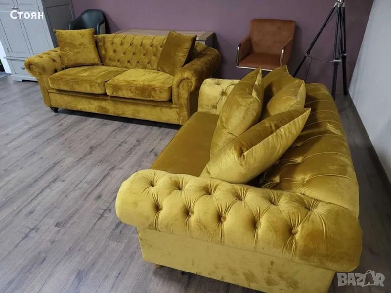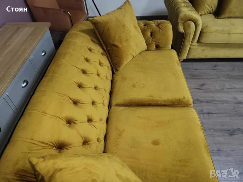 Жълт комплект дивани от плат - плюш тройка и двойка .