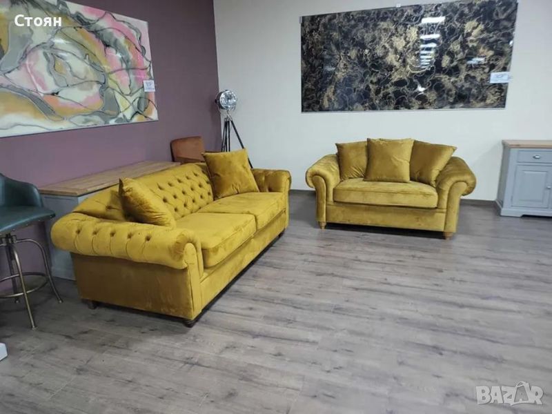 Жълт комплект дивани от плат - плюш тройка и двойка