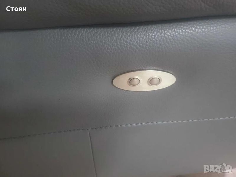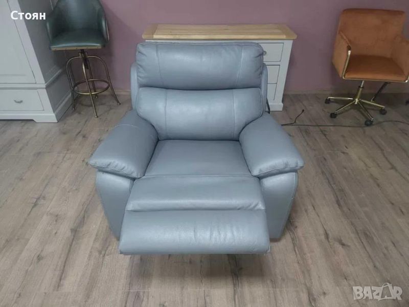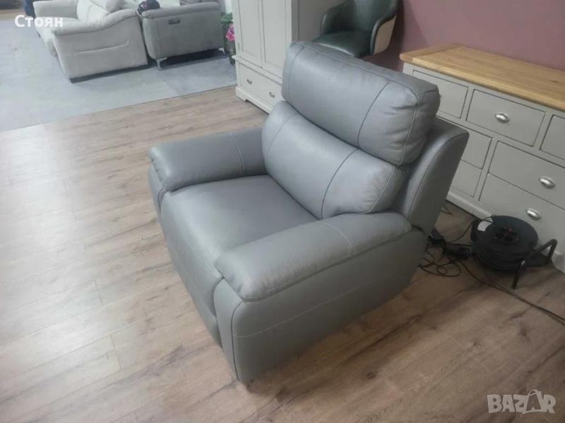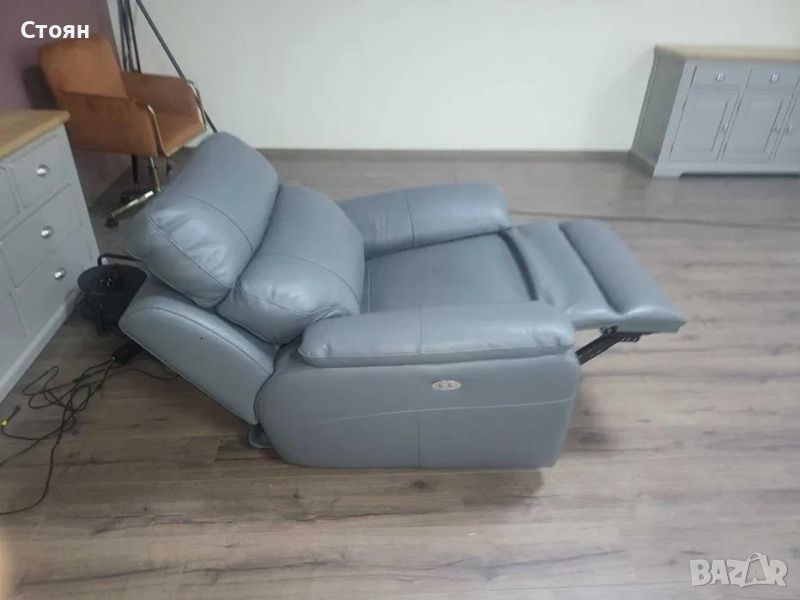 Сив кожен фотьойл с електрически релаксиращ механизъм.
