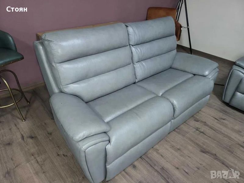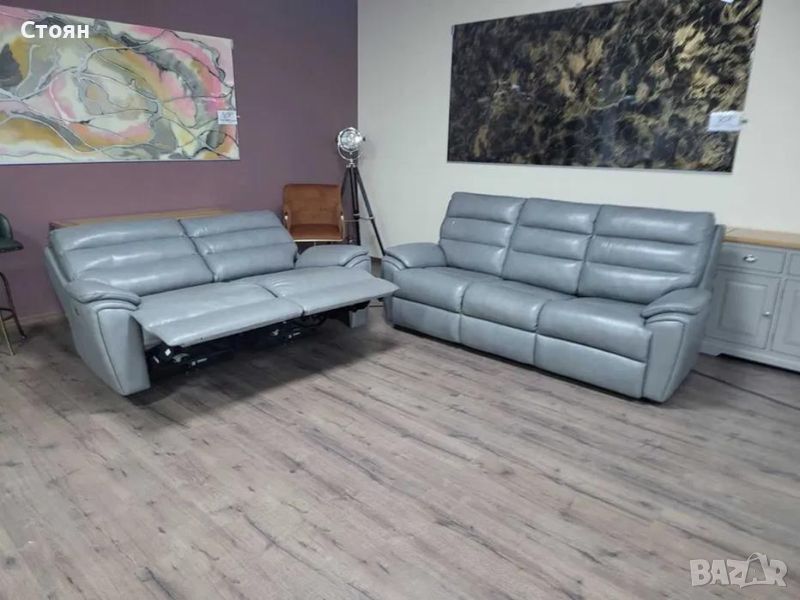 Американски сив кожен комплект тройка и двойка La-z-boy в отлично състояние. Диванът двойка е с електрически релаксиращ механизъм за краката.