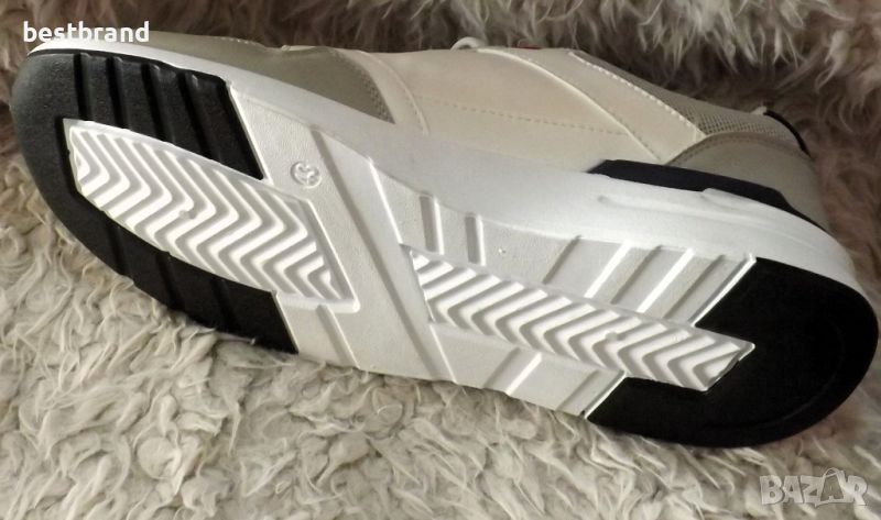 Мъжки маратонки от еко кожа,с връзки, в бял цвят, и гарнитура от сиво и синьо ,към петата. Удобен модел за ежедневието. Отговарят си на номерата.