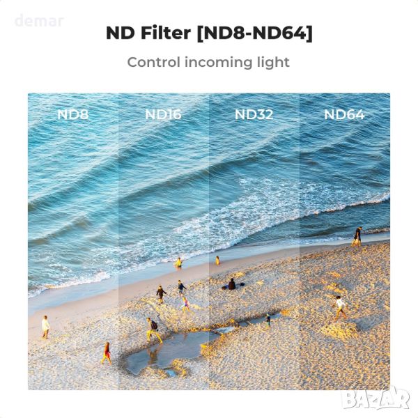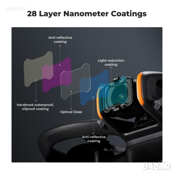 Комплектът от 4 броя ND филтри за DJI Avata 2 включва филтри ND8, ND16, ND32 и ND64. Проектирани за изключително лека безопасност при само 1,2 g на филтър, те са направени от първокласно AGC оптично стъкло с 28 многослойно покритие за оптимално качество на изображението, намаляващо светлината с 3 до 6 f-стопа за балансирана експозиция при различно време условия. Покритието отблъсква вода, прах, мазнини и драскотини, осигурявайки лесна поддръжка и защита. Отличаващи се с дизайн с щракване, тези филтри предлагат бърза инсталация и сигурно закрепване, без да засягат кардана или калибрирането.