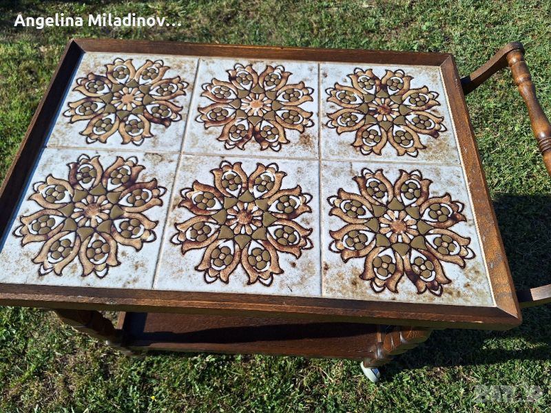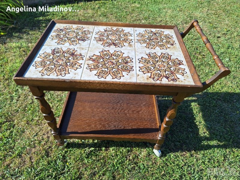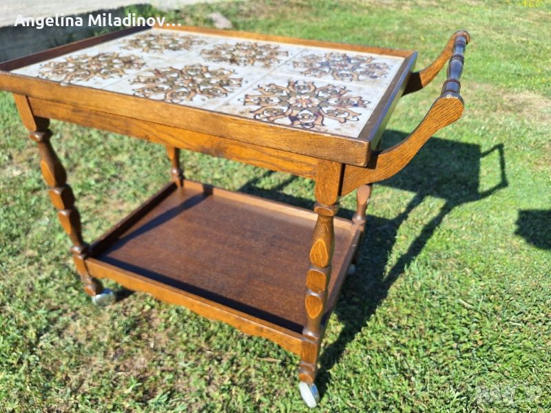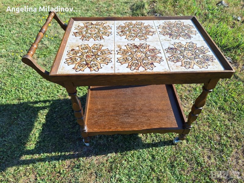 Голяма количка изцяло изработена от дъбова дървесина и порцеланови плочки, внос от Дания. Многофункционална количка на две нива, подходяща като барче за напитки помощна маса или просто за декорация във вашия дом, офис или магазин. Ще подчертае различното в дома ви. Разгледайте и другите ми обяви. Предлагаме и изгоден транспорт за цялата страна.