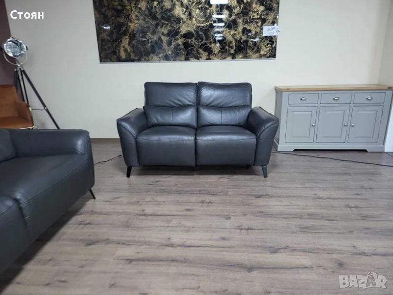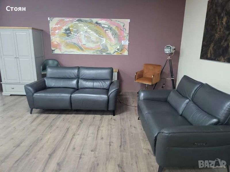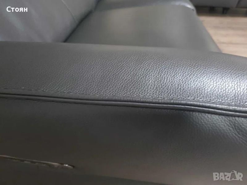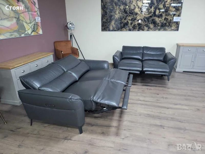Сив кожен комплект дивани тройка и двойка с електрически релаксиращ механизъм за краката в отично състояние.