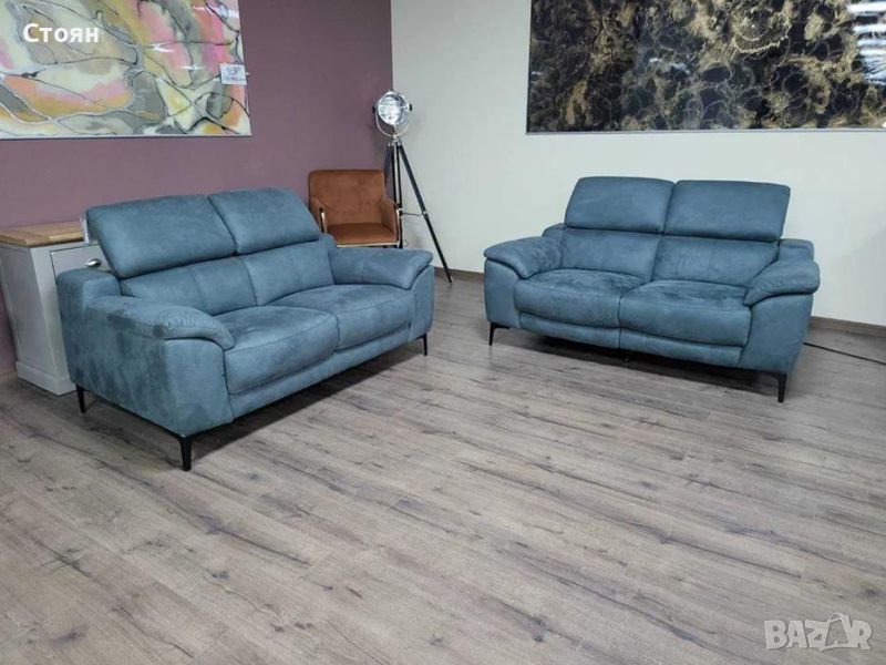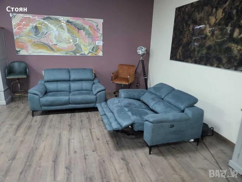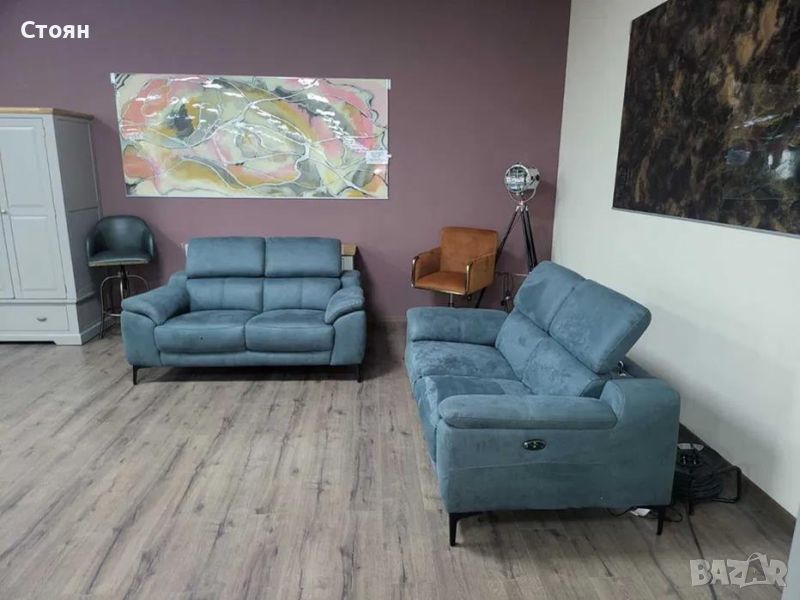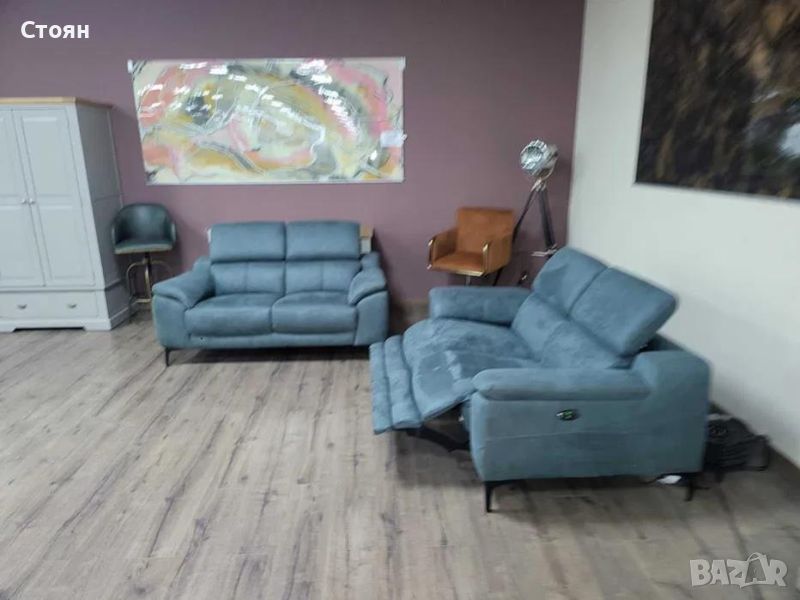 Син комплект дивани от плат две двойки с подвижни облегалки. Единият диван е с електрически релаксиращ механизъм за краката.