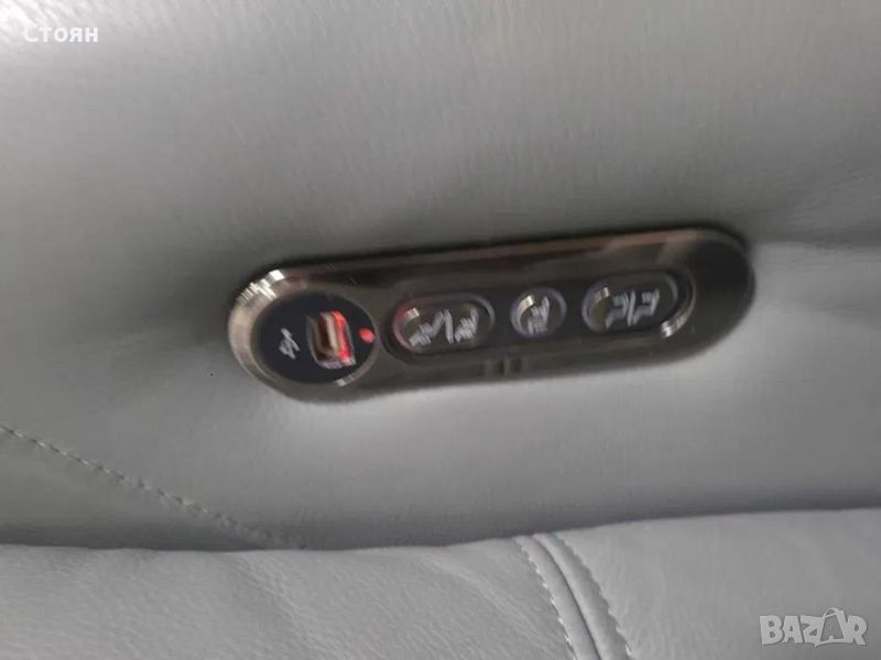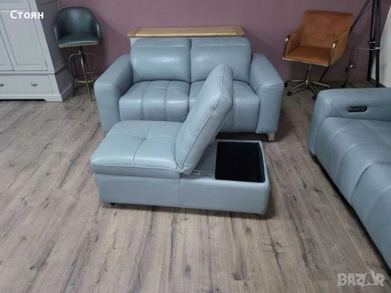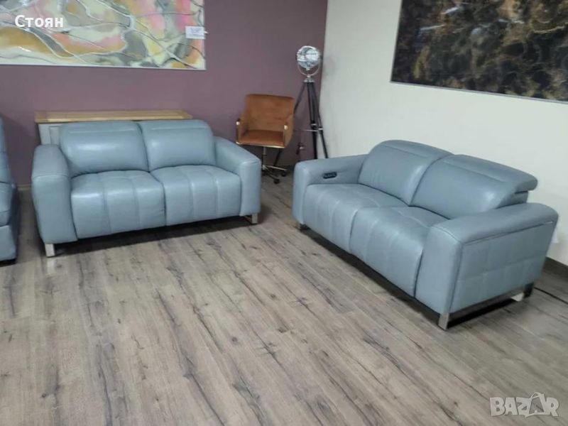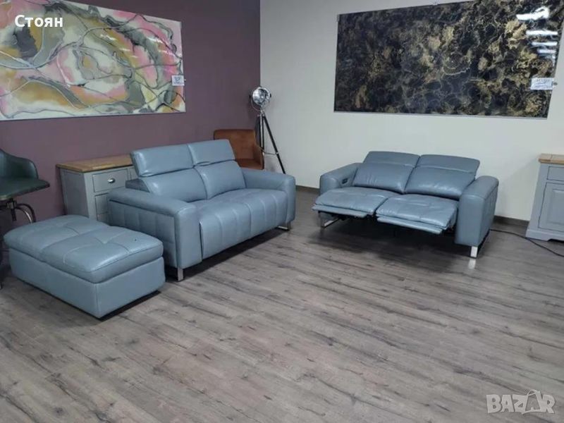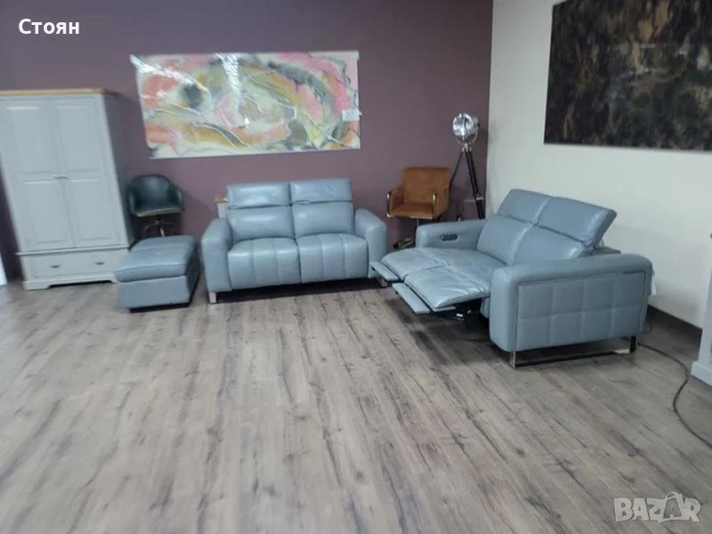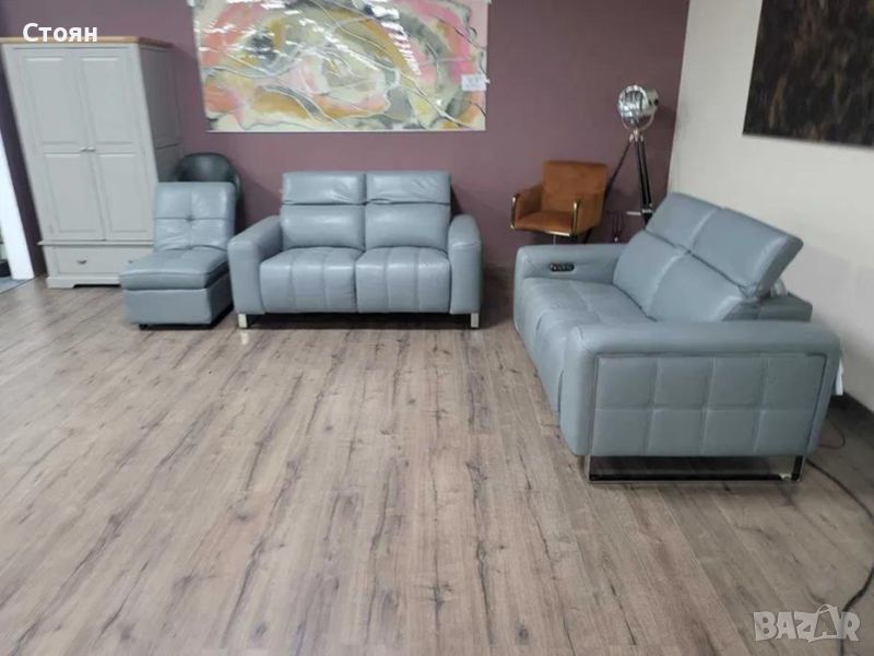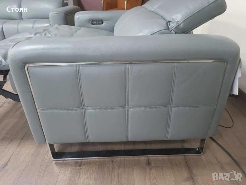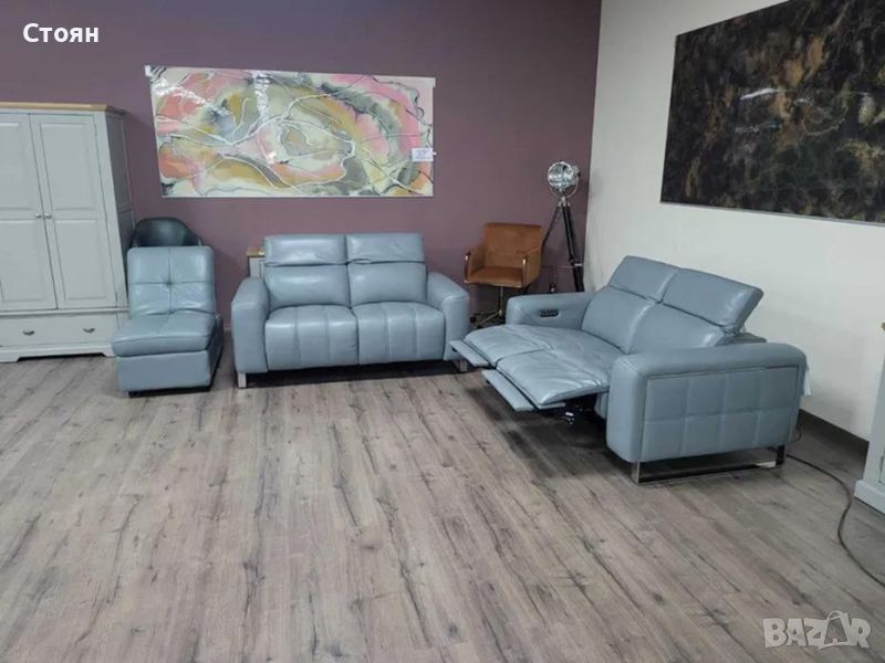 Сив кожен комплект дивани две двойки и табуретка. Единият диван двойка е с електрически релаксиращ механизъм за краката и облегалките. Другият диван двойка е с подвижни облегалки, които се отварят ръчно. Табуретката е тип ракла и може да бъде използвана като малък стол.