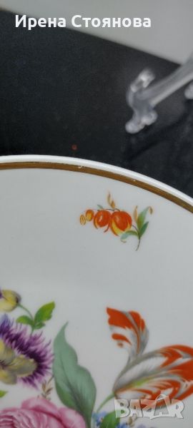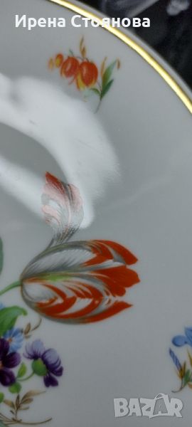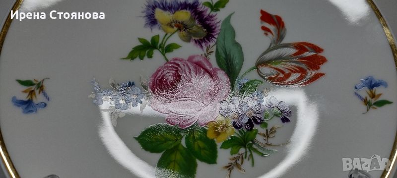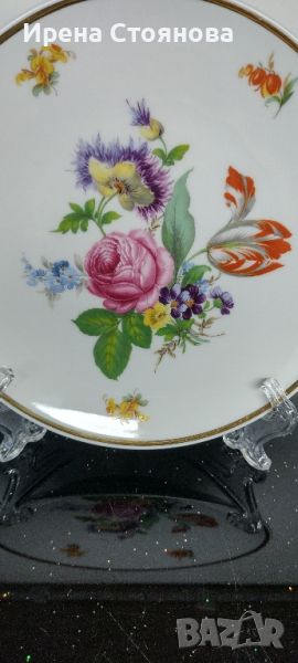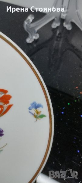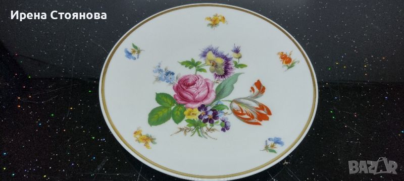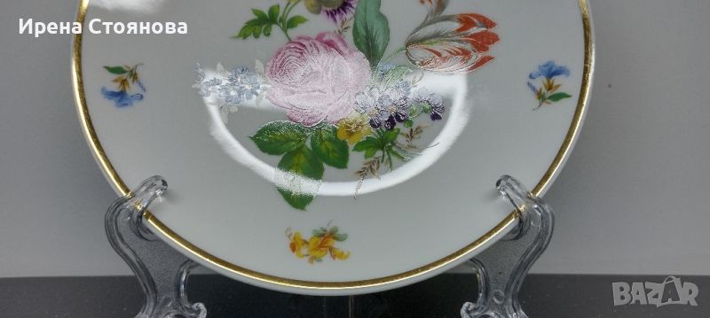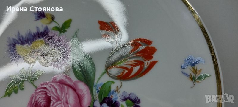 Чиния за стена Vohenstrauß Johann Seltmann, след 1955 г. Декор с цветя, наситени цветове и златен кант. Минимални, незабележими следи от употреба/ съхранение и на няколко места точки прекъснат кант. Диаметър 19,7 см. Цена 40 лв.