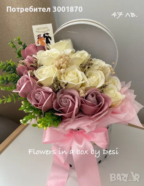 Аранжирани сапунени рози в кутии букет в кутия подарък цветя, снимка 1 - Изкуствени цветя - 46492231 Аранжирани сапунени рози в кутии букет в кутия подарък цветя, снимка 2 - Изкуствени цветя - 46492231 Аранжирани сапунени рози в кутии букет в кутия подарък цветя, снимка 3 - Изкуствени цветя - 46492231 1/3