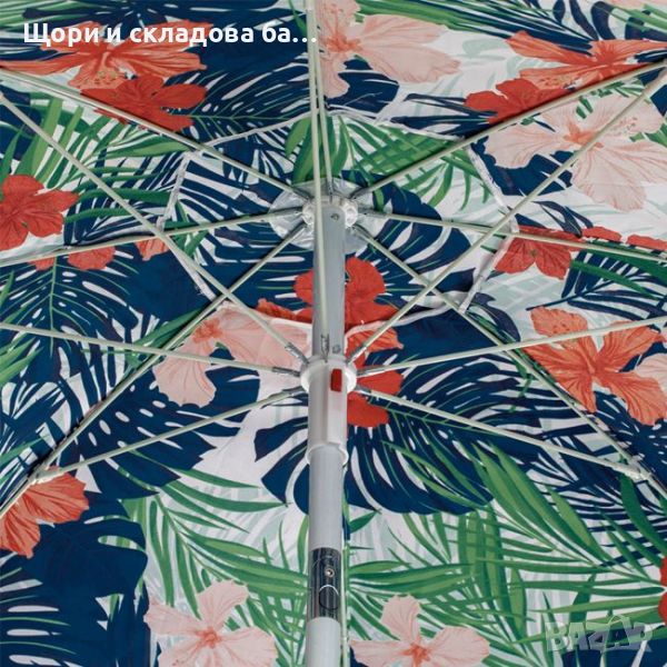 Плажен чадър, ветроустойчив, цветни тропически цветя, накланяща се метална рамка Ø2 м Описание - Характеристики Ветроустойчив плажен чадър с цветна материя с шарка на тропически листа и полиестерна чанта за носене със същата шарка. Има механизъм за накланяне, който заключва и фиксира накланянето. Диаметър: 200см Спици: 8, Ø5мм Рамка: Метална Плат полиестер 140гр Има въздуховод Валове: Φ28 / 32мм С механизъм за накланяне Разполага с 2 специални слота за въже за допълнително фиксиране към земята.