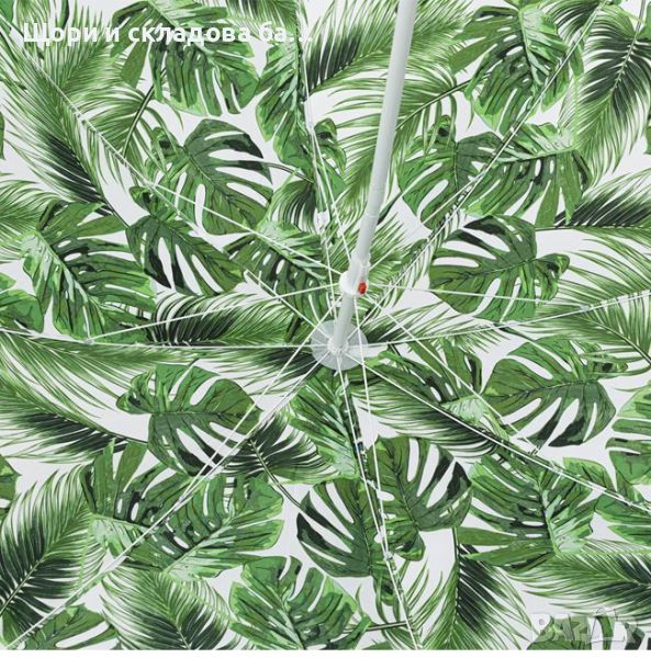 Плажен чадър с капак, зелени тропически листа, 2 пръстена, метална рамка Ø2 м Описание - Характеристики Плажен чадър с плат в бяло, с шарка на зелени тропически листа и платнена чанта с мрежа. Платът падащ по периметъра (клапа) е дълъг (8см) за повече сянка. Диаметър: 200см Спици: 8, Ø3мм Рамка: Метална .