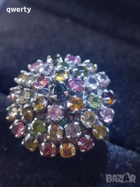 Нов сребърен пръстен с кръгла корона, ръчна изработка с естествени турмалини . Размерите са на снимките.