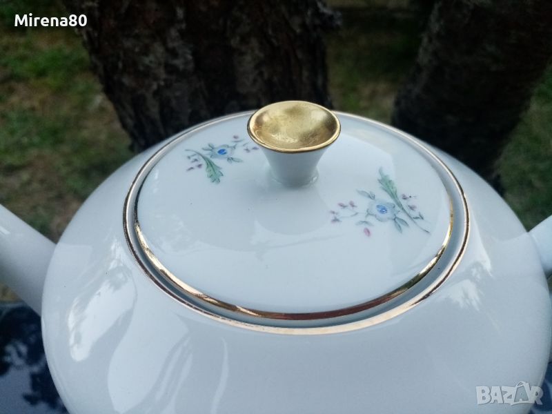 Много стилен и елегантен чайник от немски порцелан, произведен втората половина на миналия век в Германия. Фин безупречен порцелан с флорален мотив и златен кант. Вмест. 1.200 л. Отлично състояние !