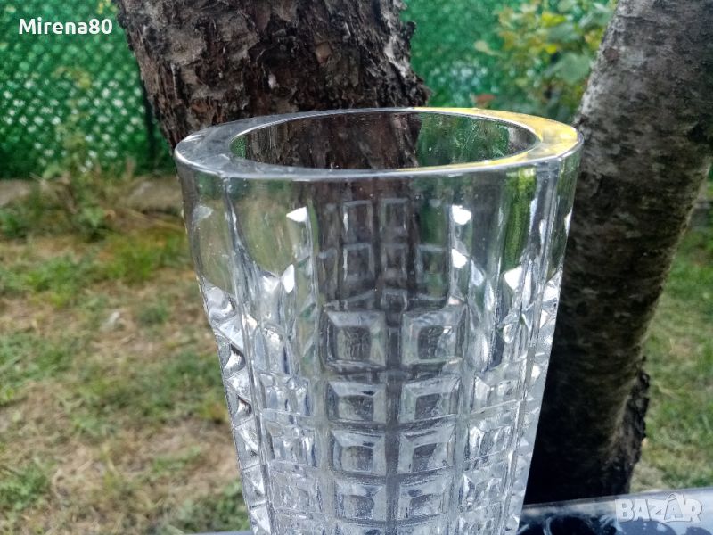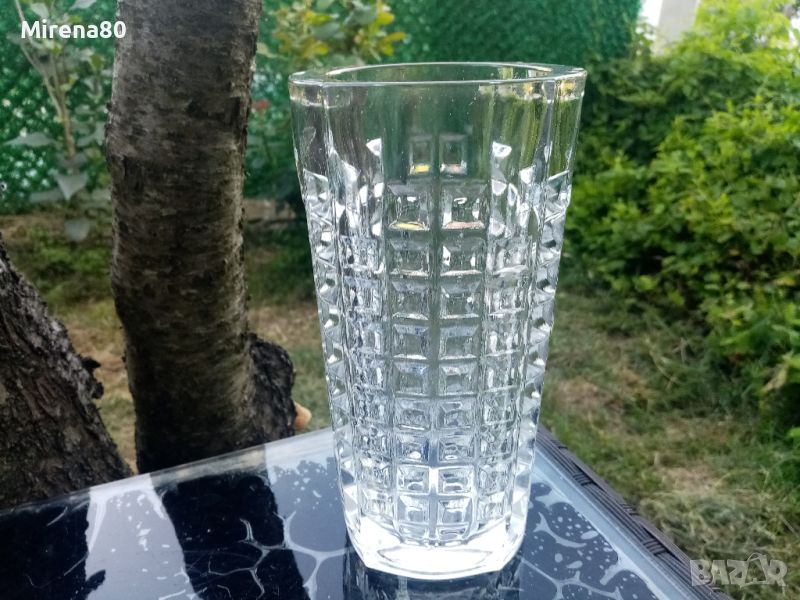 Много тежка и масивна ваза от дебелостенен оловен кристал - 1600 гр. Великолепен релеф и блясък. Отлично състояние, единствено има минимално чипче на ръба - НЕ се забелязва, почти не се и напипва. Ако не кажа, че го има, няма и да го забележите. Вис. 20, диам. 10/9 см (формата не е идеално кръгла).