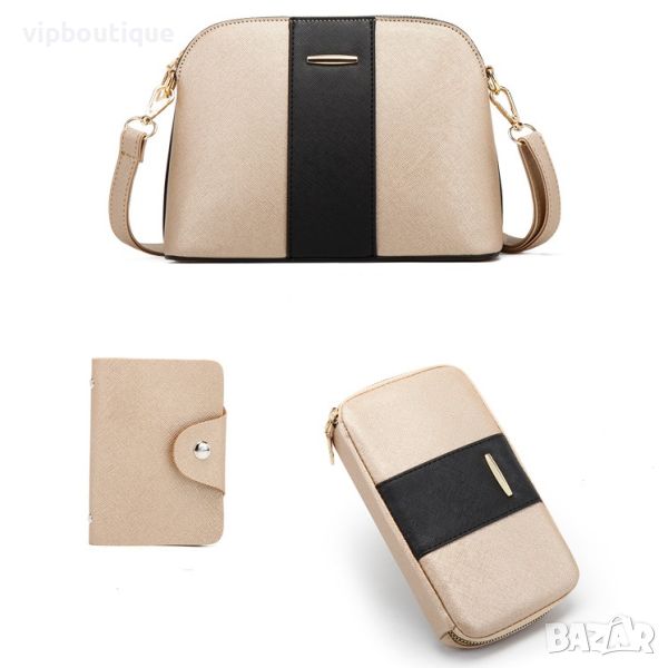 Бежова-черна кожена дамска чанта с малка дамска чанта през рамо и несесер → Обява 46496936
