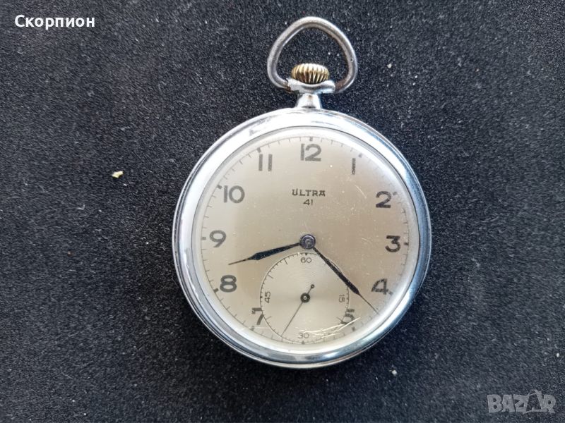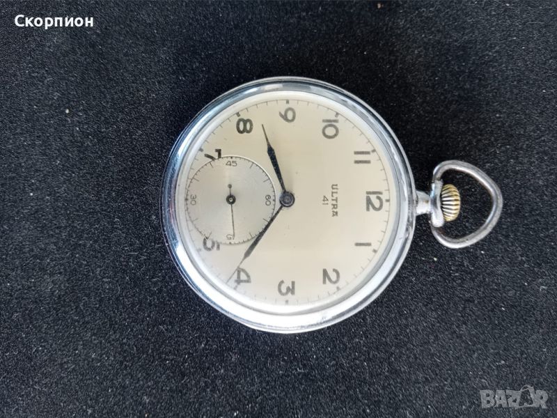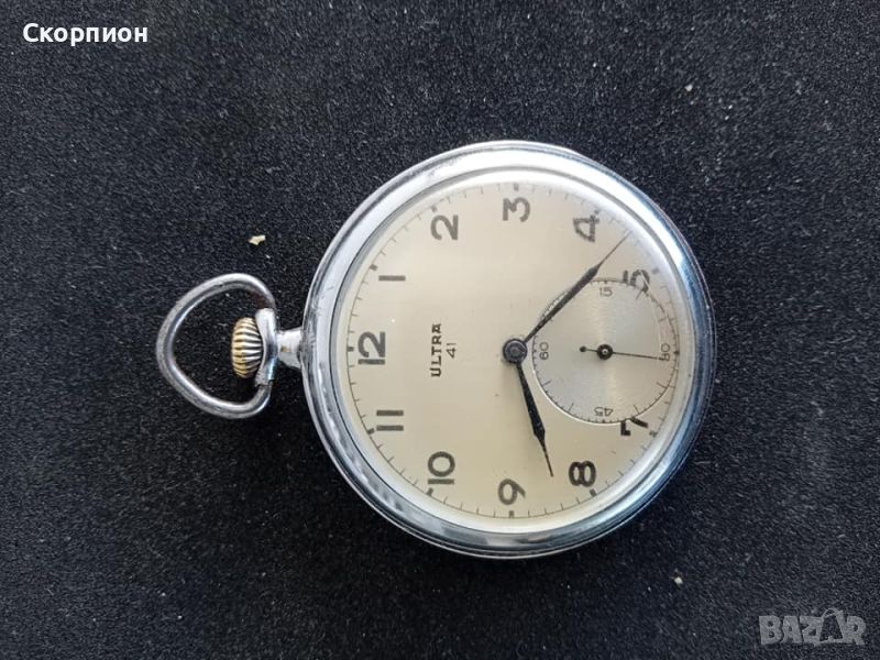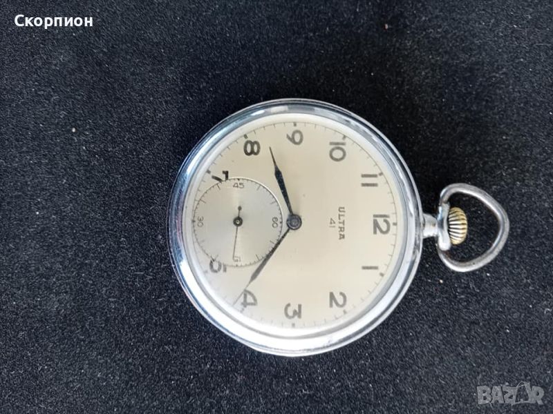 Швейцарски джобен часовник - ULTRA 41. Часовникът е почистен, смазан и сервизан и профилактиран от часовникар. Отличен външен вид - от колекция, работещ, в перфектно състояние.