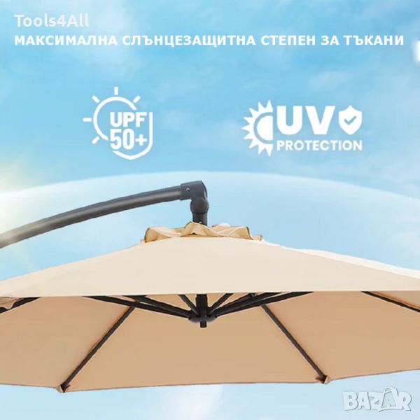 Перфектен за всяко външно пространство, включително градини, тераси и вътрешни дворове. Осигурете си сянка и комфорт през летните дни с този елегантен и функционален градински чадър.