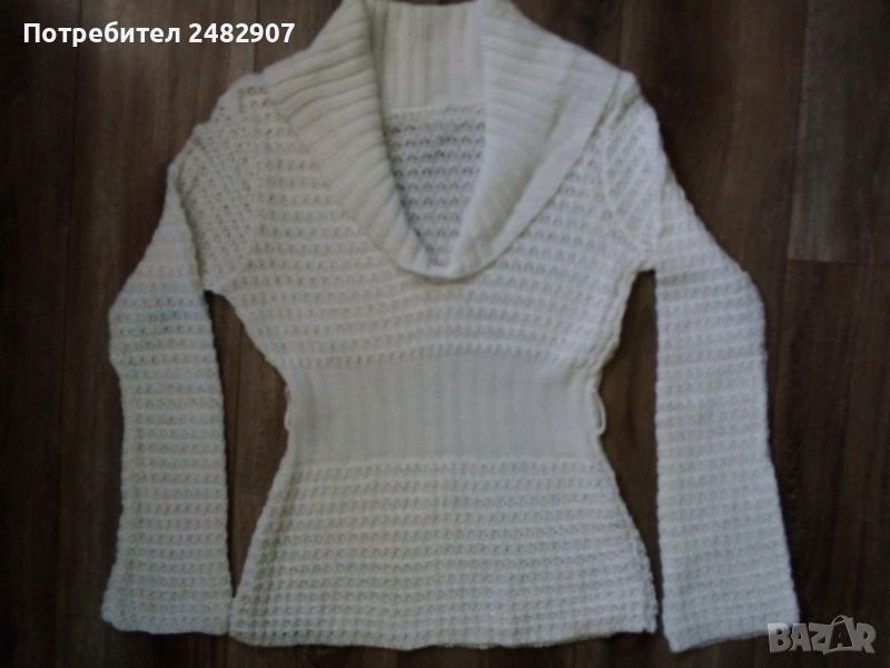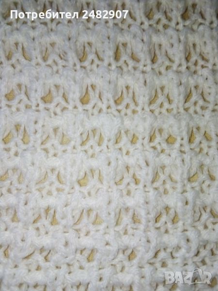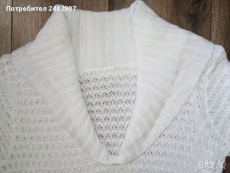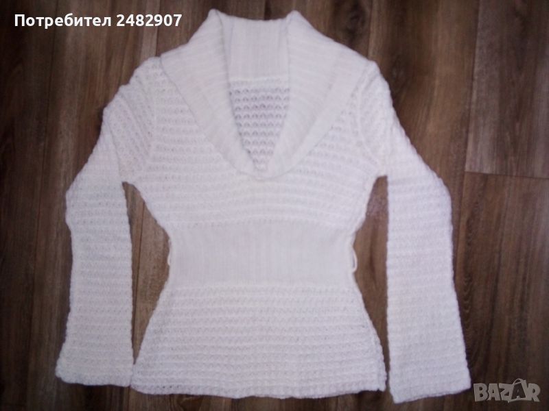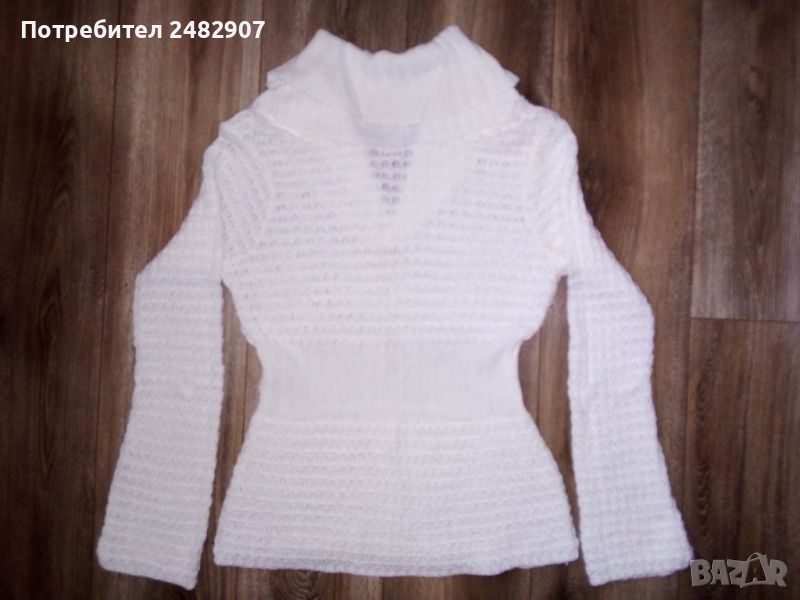Машинно плетена мрежеста дамска туника в бяло, размер S. Ширина в раменете - 47 см, ширина под мишниците - 45 см, ширина в долната част - 50 см, дължина от рамото до долу - 65,5 см, дължина на ръкава от рамото - 68 см, ширина на ръкава в долната част 15 см. Много запазена, почти не е използвана с гайки на талията и шал-яка.