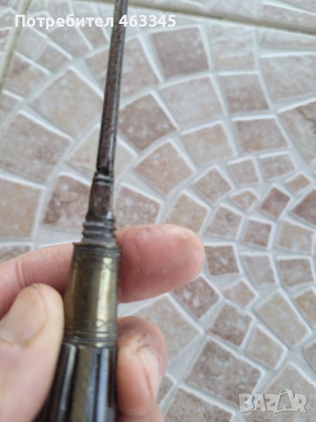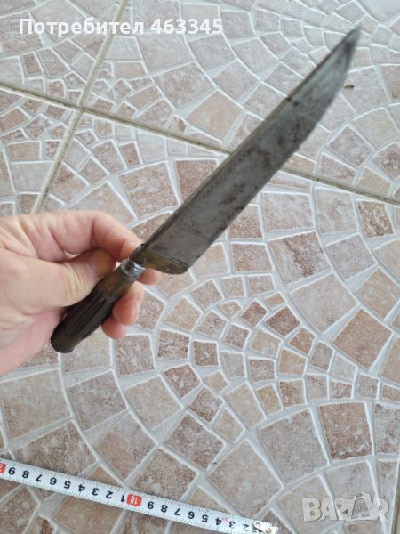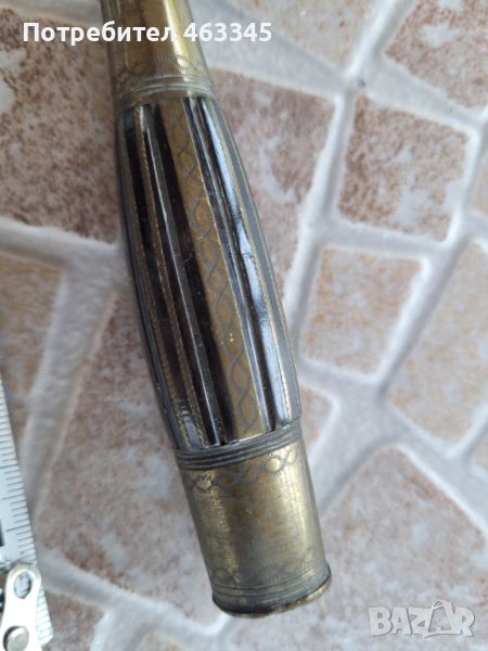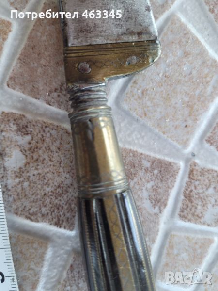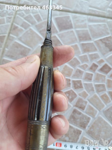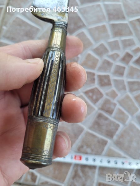 Стархотен османски нож от 19-ти век. Ножът е тип низан без ръжда и без язви по острието, но с хубава патина. Дръжката е изцяло рогова с много интересна украса. Налични месингови апликации по дръжката. Гравирано острие. Продава се с дървена ножна. Много красив нож - би бил гордост за всяка колекция