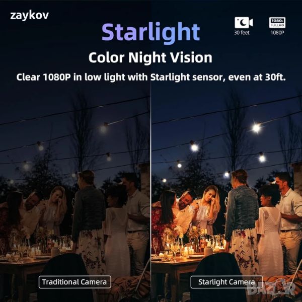 【Качество на видеото с висока разделителна способност】 Камерата за сигурност предлага разделителна способност 1080P Full HD, което гарантира, че всеки детайл е уловен ясно и точно. С цветно нощно виждане на звездна светлина ще можете да виждате движения ясно дори при условия на слаба светлина (в рамките на 30 фута). Препоръчително е да зададете черно-бял режим за нощно виждане на тъмно.