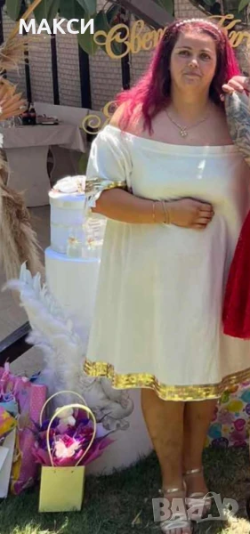 Елегантна рокля в бяло със златисти елементи и пискюли- 100 % памук, снимка 1 - Рокли - 46505596 Елегантна рокля в бяло със златисти елементи и пискюли- 100 % памук, снимка 2 - Рокли - 46505596 1/2