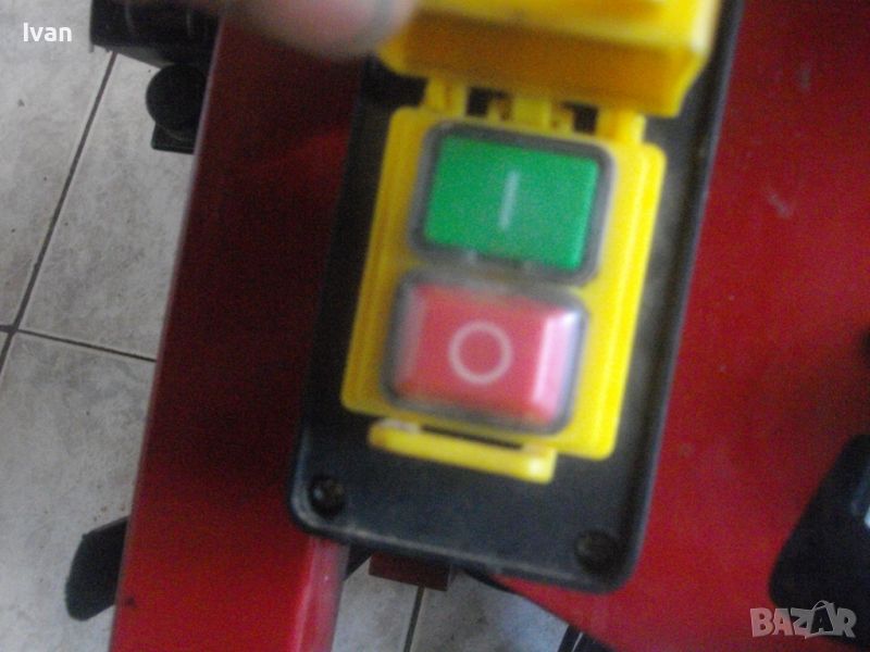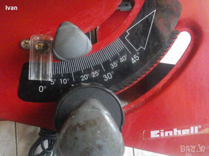 циркуляр Ейнхел. 399 лв. Марка модел - Einhell RT-TS-1221. Производител - IBC GbmH Germany - производство - Made in P.R.C. /1/ - регион 1 - за ЕС. Машината е с много запазен външен вид, почти нова ,в отлично техническо/работно съсотяние. Голяма мощност от 1200 вата, 200 к.с. 1 скорост от 4500 об/мин. Височина на рязане до 45 мм, ъгъл рязане 0-45 градуса. За дискове размер ф 210мм х 30 х 2,6 мм.. Поставен оригинален диск на машината с твърдосплавни частици на зъбите - като нов. Основен плот метален с размери 400 х 570 мм, с линеал алуминиев на плота от едната страна, разграфен до 40 см. Втори отварящ се до 20 см на дължина плот, с регулируемо отваряне и метални крака, които се сгъват/разгъват. Наличен оригиналният капак над диска с конектор за отпадъчен прах, на който се скачва маркуч на строителна прахосмукачка.Височина на машината от земята без диска - 30 см, с диска и капака над диска - 44 см. Предни пускови бутони в конзола кутия със защитен капак над бутоните - антипрахов. Ноличен на конзолата бутон рестарт. Тегло на машината - 15,5 кг. Цена - 399 лв.