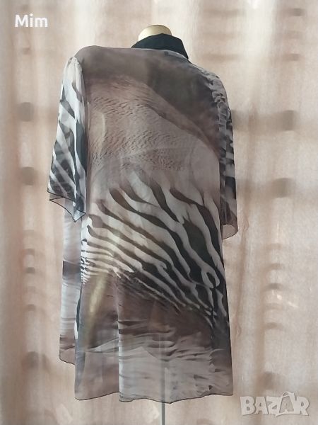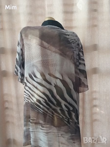 Прозрачна свободно туника в сиво с черна яка ,отпред е отворена гръдна 73 до 80 см едностранно, надолу се спуска свободно, дължина 86 см. Няма забележки