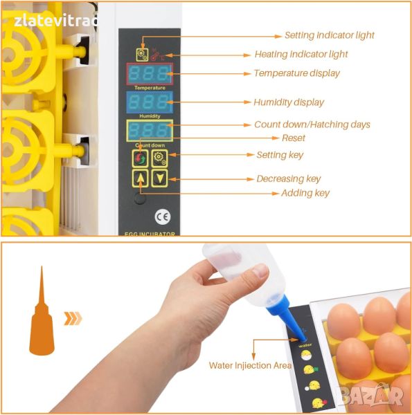 Няма нужда да отваряте инкубатора, когато добавяте вода, а машината е оборудвана със специална бутилка за пълнене, която може да се напълни с вода директно отвън. Така намялавате риска от спад на температурата, поради честото отваряне и добавяне на вода.