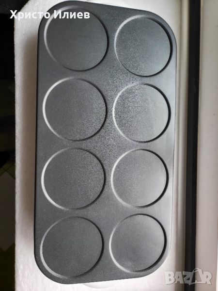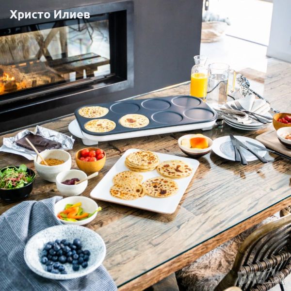 Уредът работи без забележки. Има предоставени реални снимки. В оригинална опаковка.Това страхотно устройство за макси палачинки ви позволява да правите осем мини палачинки едновременно. По желание палачинките могат да се приготвят или изпекат директно на масата с всякакви гарнитури.Готвенето на масата е парти забавление за успешно и спокойно хранене във весел кръг! Забавното готвене е уникално изживяване!Можете също да направите мини пици или палачинки, палачинки с уреда за палачинки.Уредът за палачинки може да пече до 8 палачинки или 8 пици едновременно и е снабден с незалепващо покритие и подвижен кабел.Макси