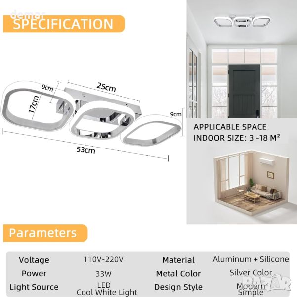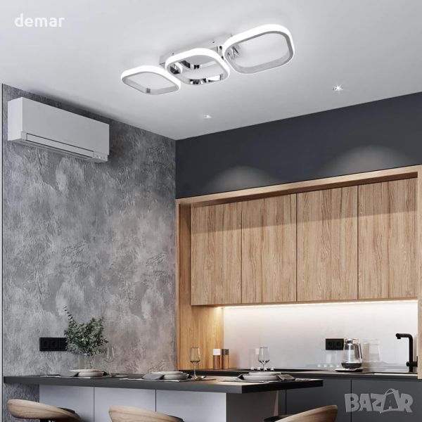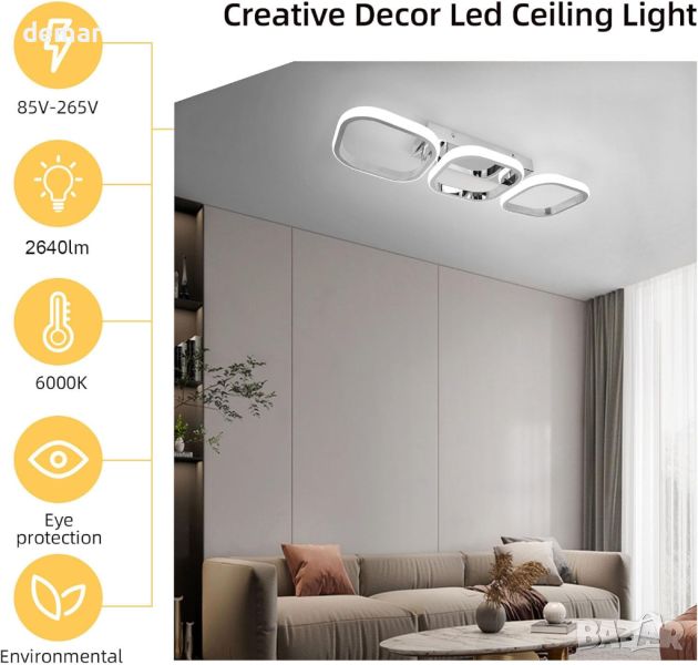 Модерното LED таванно осветление се отличава с три деликатни хромирани алуминиеви квадрата, предлагащи по-измерен вид в сравнение с други осветителни тела за плосък покрив. Той е по-ярък и подходящ за различни настройки, осигурявайки вечен стил. Спецификациите включват размер L53*W17*H9cm, 220V напрежение, 33W мощност, 2760lm яркост. Изработен от хромиран алуминий и акрил, той е антикорозионен, против избледняване, устойчив на надраскване и има живот от 40 000 часа. Висококачествените LED чипове осигуряват енергоспестяващо осветление без трептене, предпазващо очите, без инфрачервени или ултравиолетови лъчи. Лесен за инсталиране, той подобрява коридорите, всекидневните, кухните, трапезариите, спалните, хотелите, стълбищата и входовете, добавяйки стилна и очарователна атмосфера към всеки интериор.