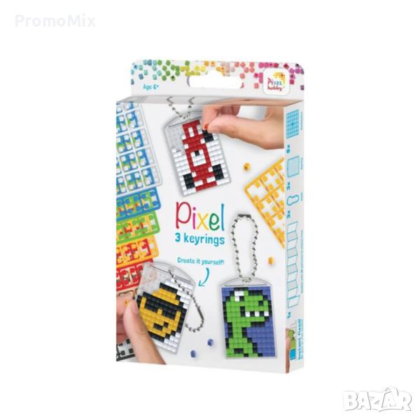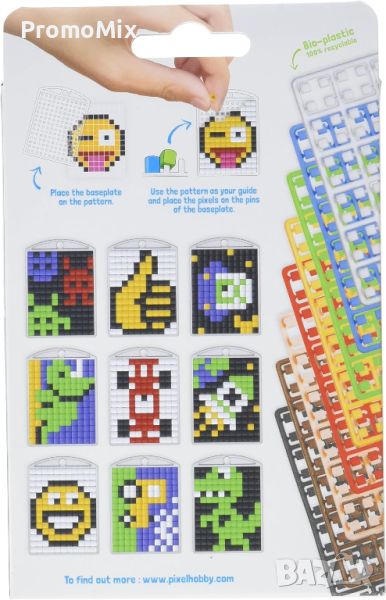 Pixelhobby Pixel P20132 е творчески комплект съставен от три основи/плочки за нареждане, които стават на ключодържатели и цветни плочки с пиксели.
