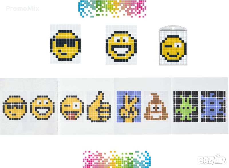 В комплекта са включени 8 цвята плочки с пиксели, които са с по 144 пиксела и няколко емоджи модела с примерен дизайн.