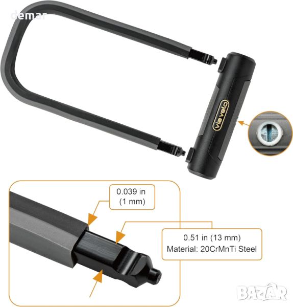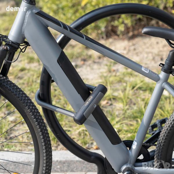 Via Velo Mini Bike U-Lock разполага със здрава 20CrMnTi стоманена конструкция, осигуряваща висока устойчивост срещу срязване и намеса за велосипеди и електрически скутери. Неговият универсален дизайн е подходящ за пътни, планински, електрически, сгъваеми велосипеди и скутери. По-голямата дължина на скобата осигурява гъвкавост при заключване около различни структури. С одобрението Sold Secure Gold, той отговаря на строги стандарти за сигурност. В допълнение, той разполага с автоматичен капак на ключалката, което го прави устойчив на прах, мръсотия, дъжд и атмосферни влияния.