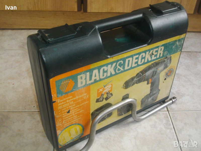 Прибрани са в пластмасов голям куфар на марката Black Decker - от винтоверт 12 волтов син на марката. Куфара е почти нова, в пълна изправност, с фабричното лого на марката на лицевата страна.Размери на куфара 345 х 270 х 90 мм.