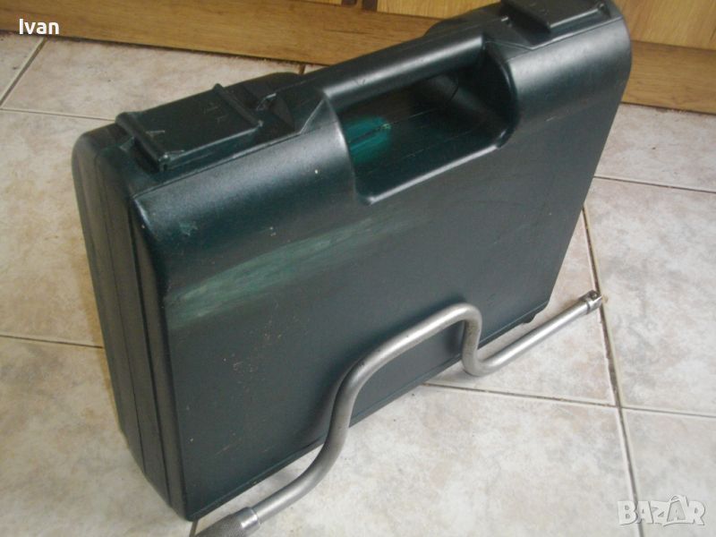 Инструментите са прибрани в голям пласмасов куфар с копчалки.