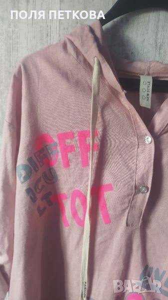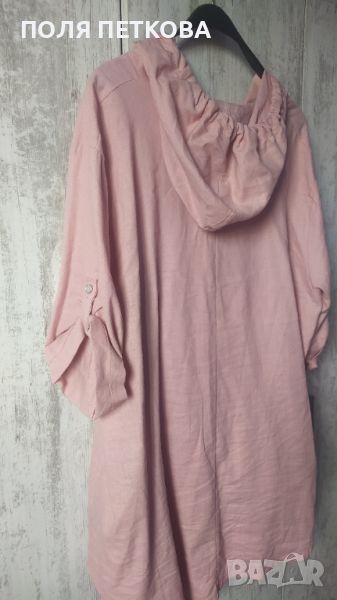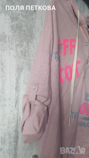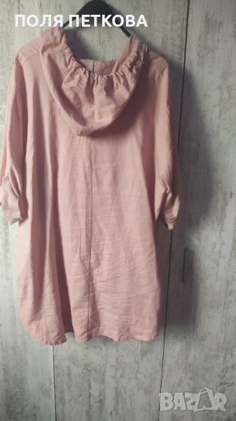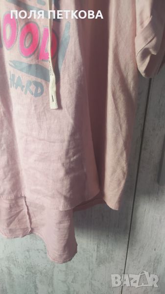 Риза туника розова с надпис и качулка материя лен размер XL два пъти XL гръдна 130 ханш 140 дължина отпред 72 отзад 82 см ефектна лека и удобна без еластан