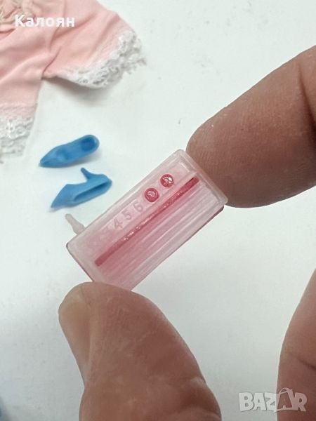Стара кукла Барби, произведена в Хонг Конг с аксесоари към нея - резервни дрехи, обувки, чантичка, радио и поставка