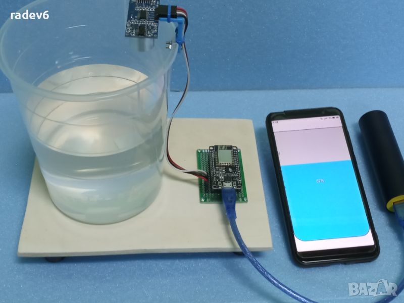 Макетът представлява система за следене нивото на водата в резервоар и визуализирането на данните посредством WEB интерфейс. Използваният контролер е NodeMCU. Нивото на водата се измерва с ултразвуковия сензор HC-SR04, като микроконтролера конвертира полученото разстояние от сантиметри в проценти.