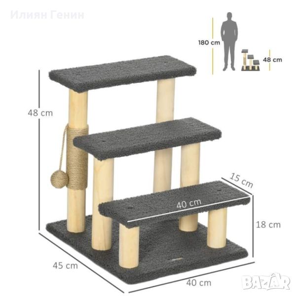 Размери: 48H x 45L x 40Wcm. Основа: 45L x 40Wcm. Повърхност на стъпалото: 40L x 15Wcm. Височина над земята: 18см, 33см и 48см. Стойка: Φ5,5 см