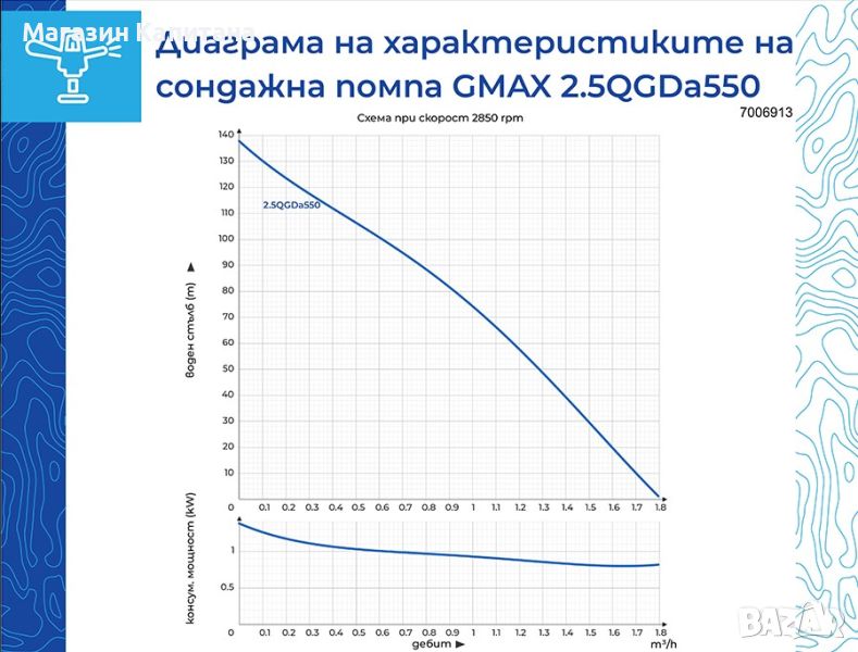 Монофазна сондажна винтова помпа за вода Gmax QGDA e с мощност 0.55 kW, напор 100 м и максимален дебит 2.1 м³/ч. Изходният отвор е 1”. Оборудвана е с кабел 20 м. Максималната температура на течността е до 35 ºС. Корпусът е изработен изцяло от неръждаема стомана.